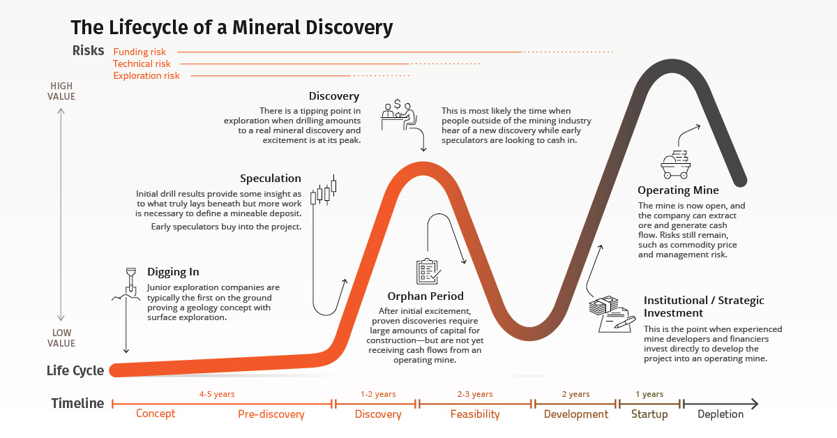 - Feasibility stage is typically a price downswing for any producer until development starts on Lassonde curve (middle down below). This can last for years. Construction expected in 2028 / production 2029 so this may take significant time. Feasibility study estimated completion Q3 2025.